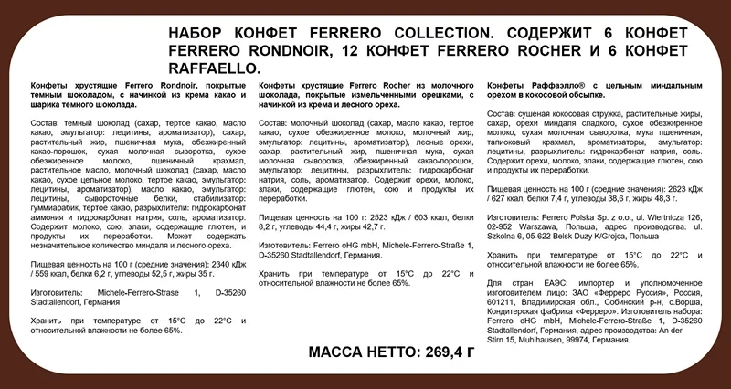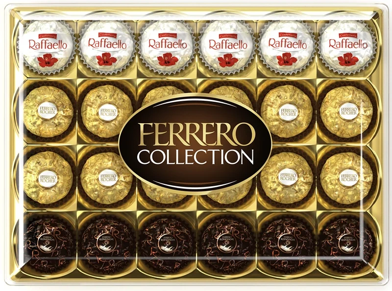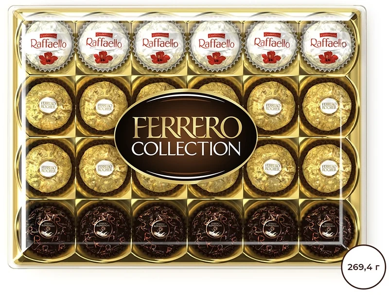 Опыт Ferrero позволил создать Ferrero Collection - изысканное ассорти из лучших продуктов компании.Rocher: сочетание цельного фундука, покрытого восхитительным сливочно-ореховым кремом, и хрустящей вафельной оболочки с шоколадом подарит вам неповторимые вкусовые ощущения.Raffaello: гармоничное сочетание тщательно отобранных ингредиентов: выращенных на островах Тихого океана кокосов и калифорнийского белого миндаля. Rondnoir: яркий вкус хрустящей оболочки из черного шоколада со сливочно-шоколадной начинкой и жемчужины темного шоколада в центре. Ferrero Collection - это разнообразие вкусов и текстур, которые подарят радость каждому.
