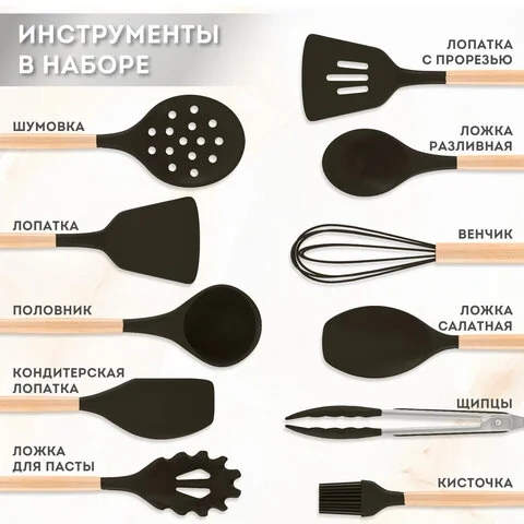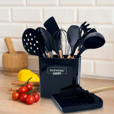 Набор силиконовых кухонных принадлежностей с деревянными ручками 13 в 1, черный, DASWERK, 608197