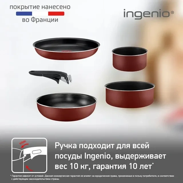 Весь набор управляется всего одной съемной ручкой Ingenio 5, с помощью которой вы легко сможете готовить в нескольких сковородах одновременно, а после – вымыть и сложить их по принципу матрешки для компактного хранения.