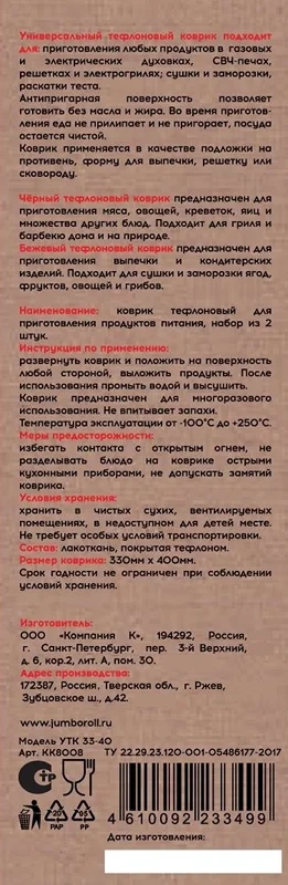 | Комплектация | тефлоновый коврик - 2 шт. |