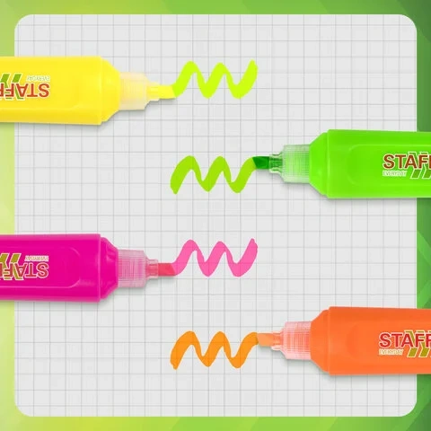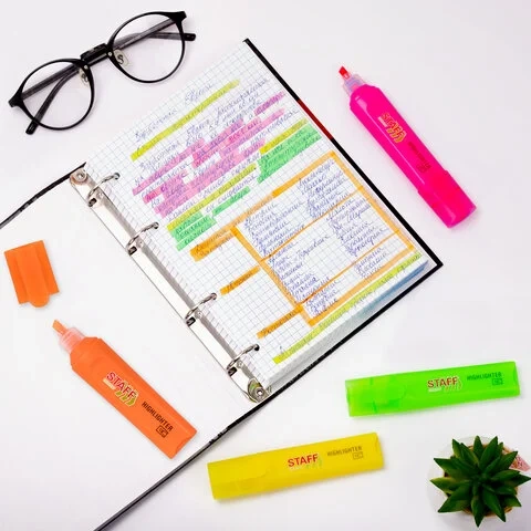 В наборе представлены 4 неоновых цвета: желтый, зеленый, оранжевый и розовый. Эти цвета позволяют ярко выделить важное в тексте.