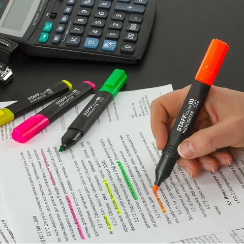 Текстовыделители из набора обладают экономным расходом чернил. Светоустойчивые чернила на водной основе не выцветают даже на открытом солнце и не размазываются в процессе использования. Изделия не перезаправляются. Колпачок с клипом и соответствует цвету чернил.