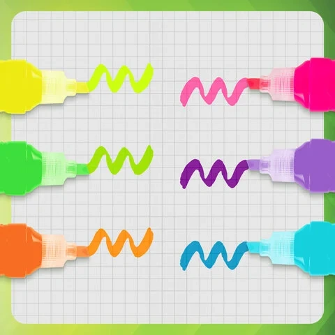 6 неоновых цветов в наборе: желтый, зеленый, оранжевый, розовый, фиолетовый и голубой, – позволяют ярко выделить важное в тексте. Колпачок и корпус соответствуют цвету чернил.