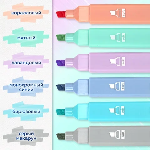 В наборе 6 текстовыделителей пастельных цветов: серый макарун, бирюзовый, монохромный синий, лавандовый, мятный, коралловый. Нежные пастельные цвета позволяют создать мягкие переходы и равномерно подчеркнуть необходимую информацию в тексте. Цвет корпуса соответствует цвету чернил.