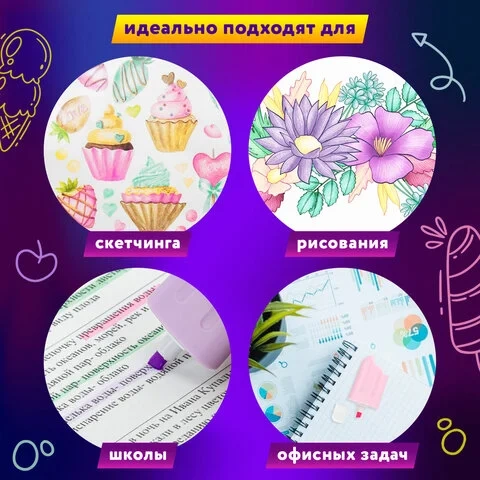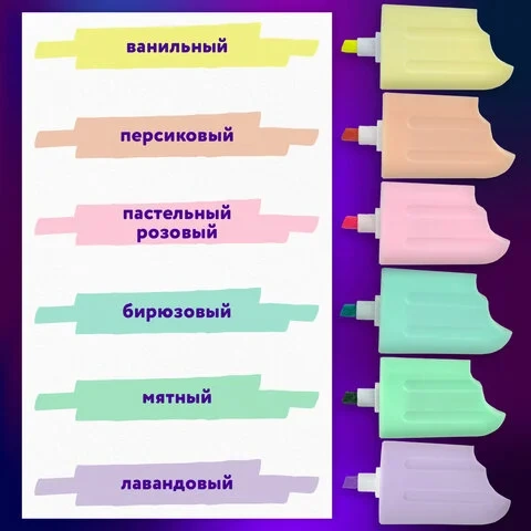 В наборе 6 пастельных цветов: бирюзовый, ванильный, мятный, персиковый, лавандовый и пастельный розовый. Особый пастельный оттенок создает мягкие переходы и равномерно подчеркивает необходимую информацию. Цвет корпуса текстовыделителя соответствует цвету чернил.