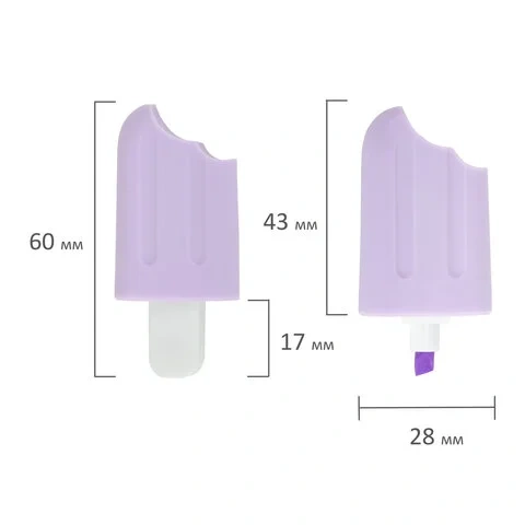Текстовыделители имеют круглую форму мороженого с диаметром 28 мм. В комплект входит прозрачная сумочка для хранения длиной 17 см. Скошенный наконечник с толщиной линии письма от 1 до 5 мм обеспечивает удобство при работе с текстом, напечатанным мелким шрифтом, или таблицами.
