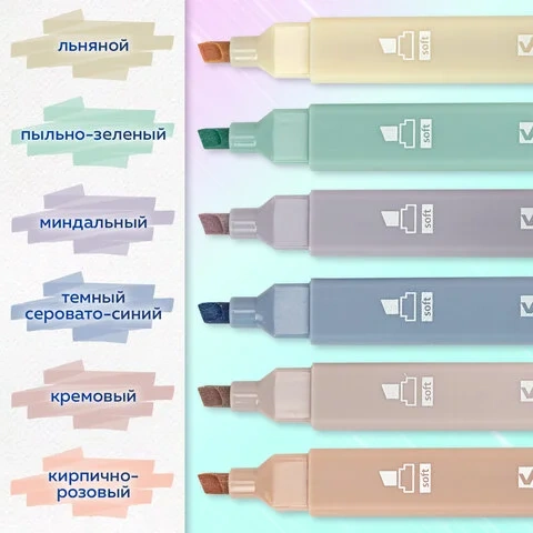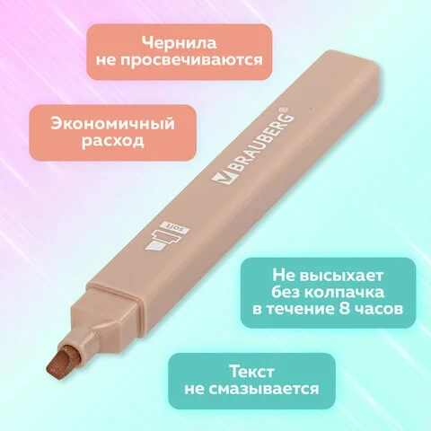 В наборе 6 двусторонних текстовыделителей цветов моранди – миндальный, кирпично-розовый, темный серовато-синий, льняной, пыльно-зеленый, кремовый. Нежные и приглушенные цвета Моранди позволяют создать мягкие переходы и равномерно подчеркнуть необходимую информацию в тексте. Цвет корпуса соответствует цвету чернил.