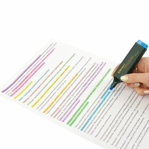 В комплект входит подставка длиной 21 см, которая обеспечивает удобное расположение набора на столе и быстрый доступ к каждому текстовыделителю. Корпус имеет плоскую форму с диаметром 25 мм, а скошенный наконечник обеспечивает линию письма толщиной от 1 до 5 мм, что удобно при работе с мелким шрифтом или таблицами.Технология и эксплуатация