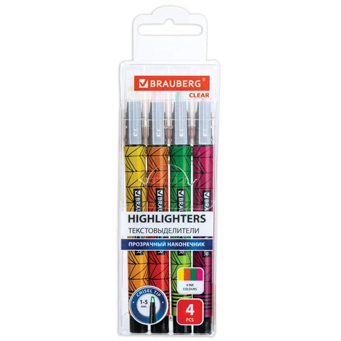 Набор текстовыделителей Brauberg Clear 4 цвета, линия письма 1-5 мм, с прозрачным наконечником