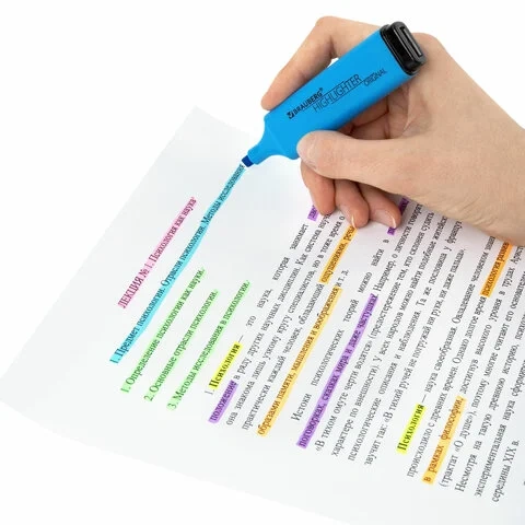 6 цветов в наборе: желтый, оранжевый, розовый, зеленый, синий, фиолетовый. Текстовыделители имеют плоскую форму корпуса, диаметр которого 25 мм. Скошенный наконечник имеет толщину линии письма от 1 до 5 мм, что обеспечивает удобство при работе с текстом, напечатанным мелким шрифтом, или таблицами. Чернила с неоновым эффектом обеспечивают неповторимую яркость выделения текста. Благодаря особой водной основе чернил текстовыделители не высыхают без колпачка в течение 8 часов. Текстовыделители обладают экономным расходом чернил, при этом длина линии письма достигает 300 метров. Чернила быстро впитываются и тем самым предотвращают размазывание в процессе использования. Светоустойчивые чернила не выцветают даже на открытом солнце. Цвет корпуса и колпачка соответствует цвету чернил.