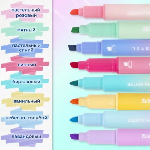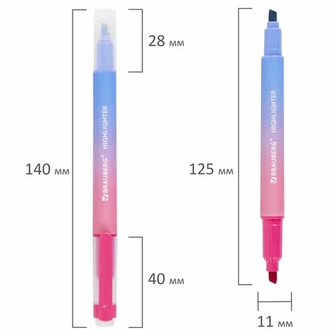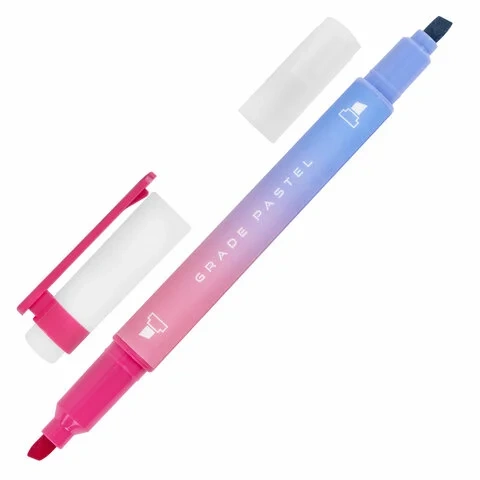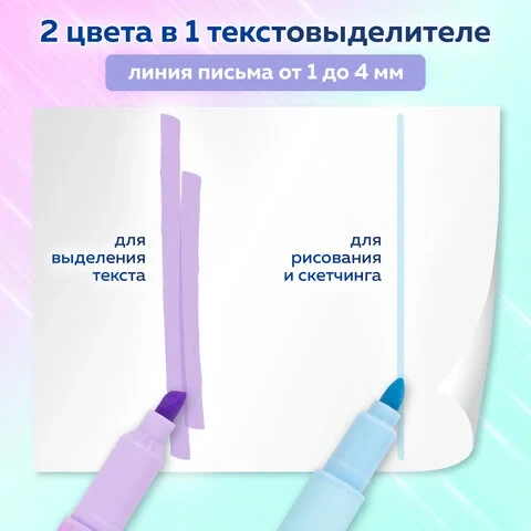 В наборе – 4 двусторонних текстовыделителя 8-ми пастельных цветов: лавандовый, бирюзовый, мятный, пастельный розовый, ванильный, небесно-голубой, винный и пастельный синий. Имеют корпус круглой формы диаметром 11 мм.