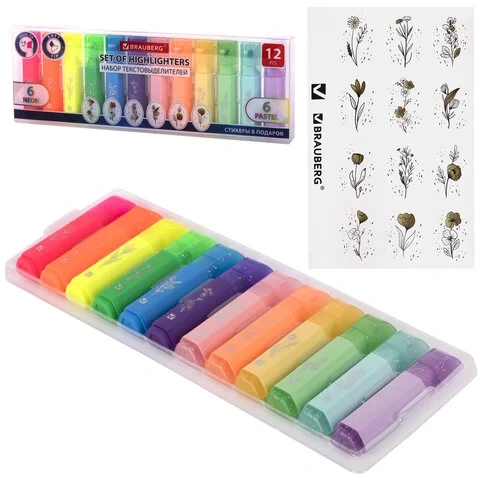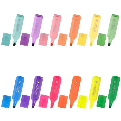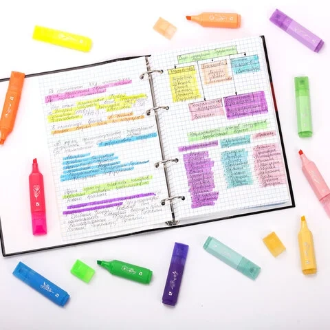 Неоновые цвета позволяют ярко выделить важное в тексте, а особые пастельные оттенки создают мягкие переходы и равномерно подчеркивают необходимую информацию. В набор также входят 6 стикеров в подарок для оформления конспектов и записей. Текстовыделители имеют прямоугольную форму корпуса диаметром 20 мм. Мягкий скошенный наконечник имеет толщину линии письма от 1 до 5 мм, что обеспечивает удобство при работе с текстом, напечатанным мелким шрифтом, или таблицами.