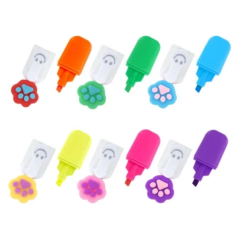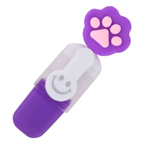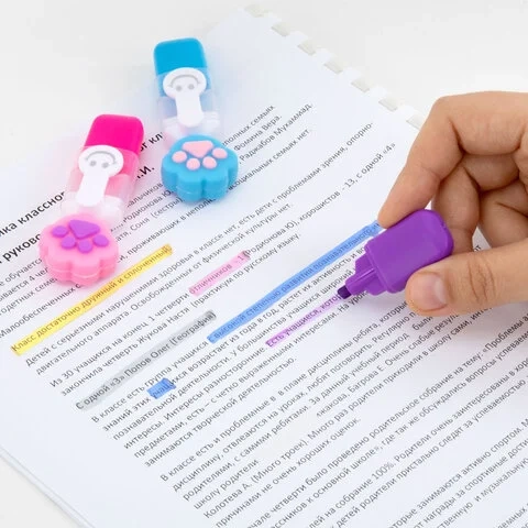Текстовыделители имеют плоскую форму корпуса с диаметром 23 мм. Колпак украшен ярким топпером в форме лапки. Скошенный наконечник с толщиной линии письма от 1 до 4 мм обеспечивает удобство при работе с текстом, напечатанным мелким шрифтом, или таблицами. В комплект входит прозрачная сумочка для хранения длиной 15,5 см.