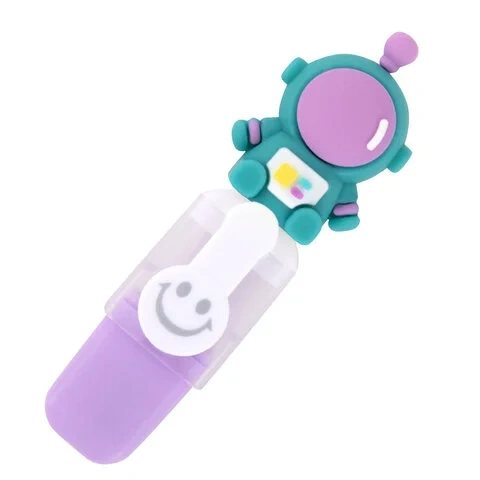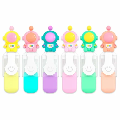 Текстовыделители имеют плоскую форму корпуса с диаметром 23 мм. Колпак украшен ярким топпером в форме космонавта. Скошенный наконечник с толщиной линии письма от 1 до 4 мм обеспечивает удобство при работе с текстом, напечатанным мелким шрифтом, или таблицами. В комплект входит прозрачная сумочка для хранения длиной 15,5 см.