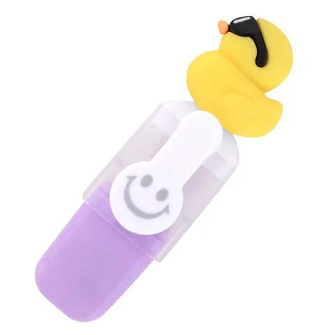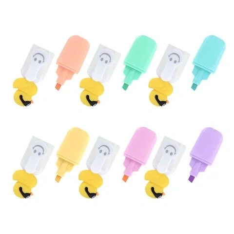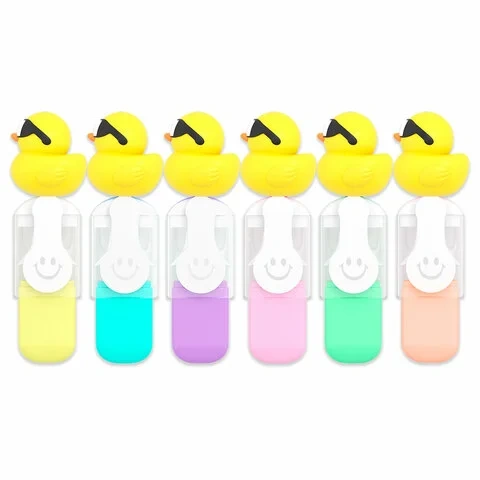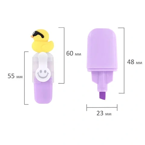 Текстовыделители имеют плоскую форму корпуса с диаметром 23 мм. Колпак украшен ярким топпером в форме утёнка. Скошенный наконечник с толщиной линии письма от 1 до 4 мм обеспечивает удобство при работе с текстом, напечатанным мелким шрифтом, или таблицами. В комплект входит прозрачная сумочка для хранения длиной 15,5 см.