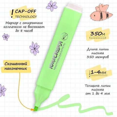 В наборе шесть пастельных цветов: ванильный, мятный, пастельный розовый, бирюзовый, лавандовый и персиковый. Плоская форма корпуса, диаметр которого 18 мм. Особый пастельный оттенок создает мягкие переходы и равномерно подчеркивает необходимую информацию. Скошенный наконечник имеет толщину линии письма от 1 до 4 мм, что обеспечивает удобство при работе с текстом, напечатанным мелким шрифтом, или таблицами. Благодаря особой водной основе чернил текстовыделитель не высыхает без колпачка в течение 8 часов. Текстовыделитель обладает экономным расходом чернил, при этом длина линии письма достигает 350 метров. Чернила быстро впитываются и тем самым предотвращают размазывание в процессе использования. Цвет колпачка и корпуса соответствует цвету чернил.
