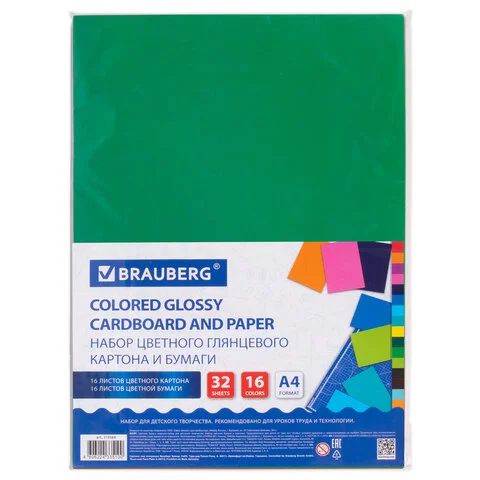 Набор состоит из 16 листов мелованного (глянцевого) картона и 16 листов мелованной (глянцевой) бумаги. 8 разнообразных цветов картона (по 2 листа на цвет) и 16 цветов бумаги надолго обеспечат ребенка всем необходимым для творческого процесса. Цветная бумага имеет плотность 80 г/м2, а картон - 200 г/м2, что позволит создать качественную и яркую поделку. Формат А4 позволит удобно разместить набор в рюкзаке/ранце или папке.