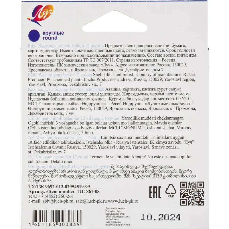 Набор восковых карандашей Луч Классика 12 цветов, восковые