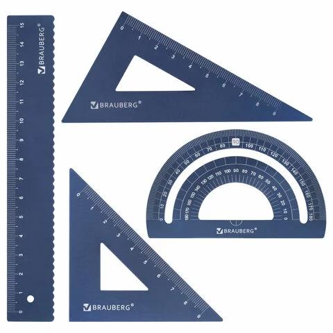 Набор чертежный металлический BRAUBERG (линейка 15 см, 2 треугольника, транспортир), 210816