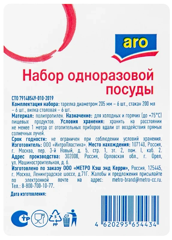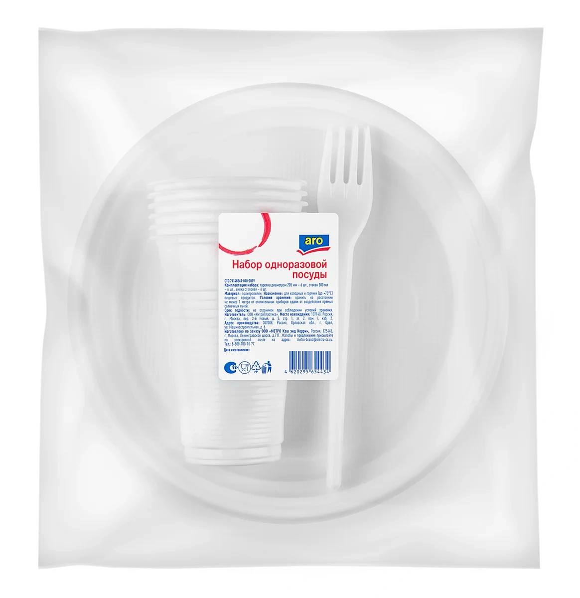aro Набор одноразовой посуды тарелка + стакан + вилка, 6шт