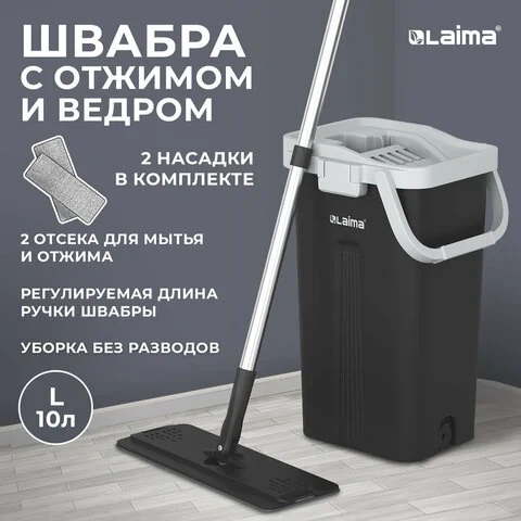 Швабра с отжимом и двухкамерным ведром, 3 насадки из микрофибры, 7 литров, LAIMA COMPACT MOP, 607389