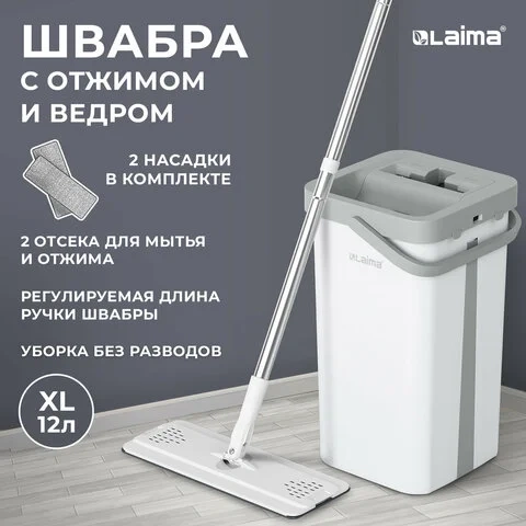 Швабра с отжимом и ведром NeoMop XL (12 л), 2 насадки микрофибра, длина ручки 134-154 см, LAIMA, 609