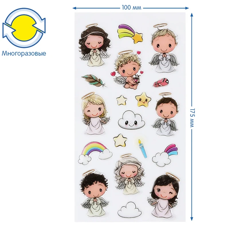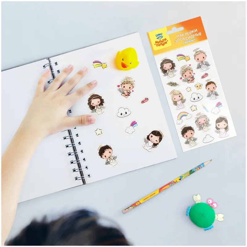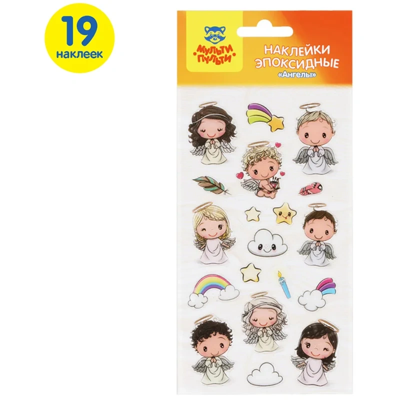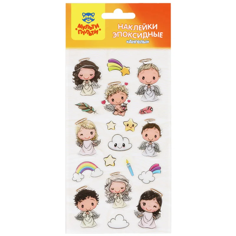 Эпоксидные наклейки «Ангелы» ? это отличный материал для творчества и игры. В наборе «Мульти-Пульти» 19 наклеек. Размер листа 110*220 мм. Наклейки можно использовать для украшения и декорирования, а также для игр, оформления рисунков, открыток. Эпоксидные наклейки обладают выпуклой, прозрачной и гладкой поверхностью, приятной наощупь. Комбинируя наклейки из различных наборов «Мульти-Пульти» можно придумать целые творческие сюжеты!