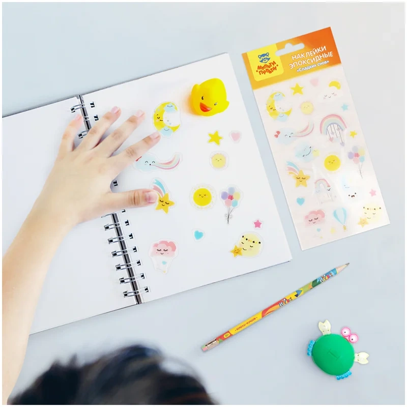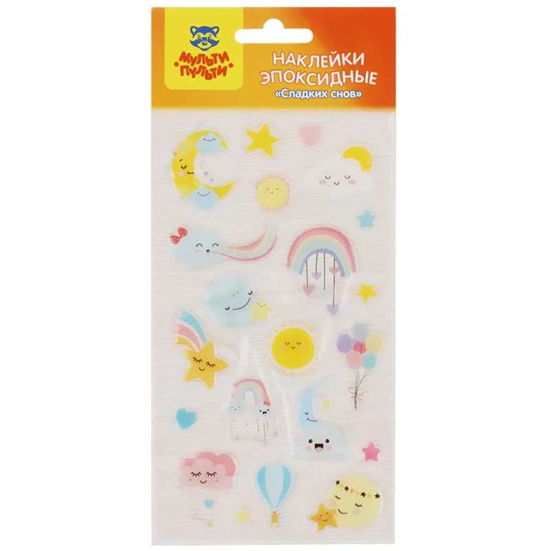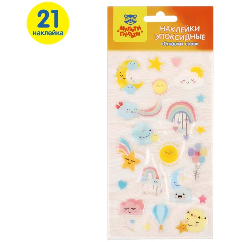 Эпоксидные наклейки «Сладких снов» ? это отличный материал для творчества и игры. В наборе «Мульти-Пульти» 21 наклейка, размер листа 110*220 мм. Наклейки можно использовать для украшения и декорирования, а также для игр, оформления рисунков, открыток. Эпоксидные наклейки обладают выпуклой, прозрачной и гладкой поверхностью, приятной наощупь. Комбинируя наклейки из различных наборов «Мульти-Пульти» можно придумать целые творческие сюжеты!