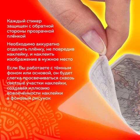 Каждый стикер защищен с обратной стороны прозрачной плёнкой. Необходимо аккуратно отделить плёнку, не повредив наклейку, и наклеить изображение в нужное место. Если Вы работаете с тёмным фоном или основой, он будет слегка просвечиваться сквозь светлые участки наклейки, создавая иллюзию вовлечённости наклейки в фоновый рисунок.