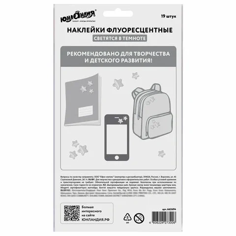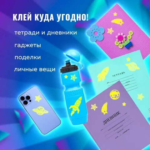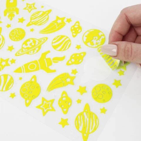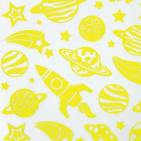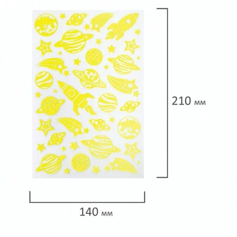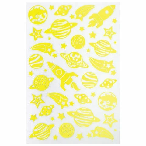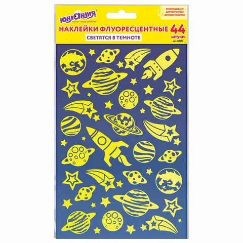 В наборе содержится 44 наклейки в форме звёзд, планет и космических кораблей. На прозрачную плёнку нанесено напыление флуоресцентной краской, благодаря чему наклейки светятся в темноте. Подойдут для украшения тетради, блокнота для записей, гаджета или любой поделки, создавая волшебное свечение!
