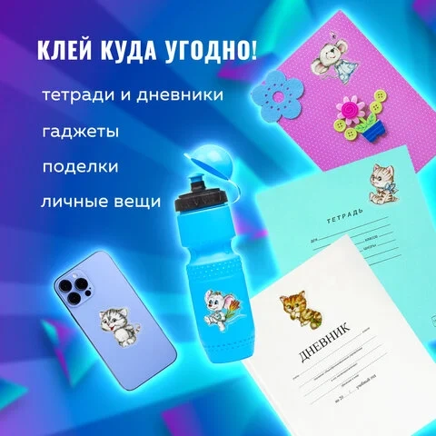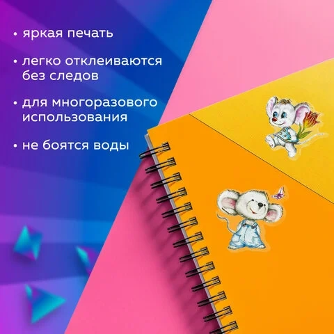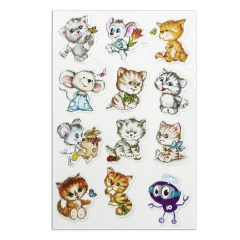 В наборе содержатся гелевые наклейки, украшенные фольгой, с изображением котят и забавных мышек в количестве 12 штук. Наклейки отличаются высочайшим качеством печати и цветопередачи. Милые акварельные пушистики придадут оригинальности тетрадям, дневникам и гаджетам или нарядно украсят поделки.