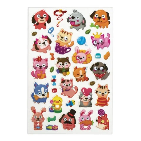 В наборе содержатся виниловые наклейки с изображением забавных животных в количестве 35 штук. Наклейки отличаются высочайшим качеством печати и цветопередачи. Весёлые собачки, симпатичные котики и милые зайки с удовольствием украсят тетради, дневники, гаджеты или поделки.