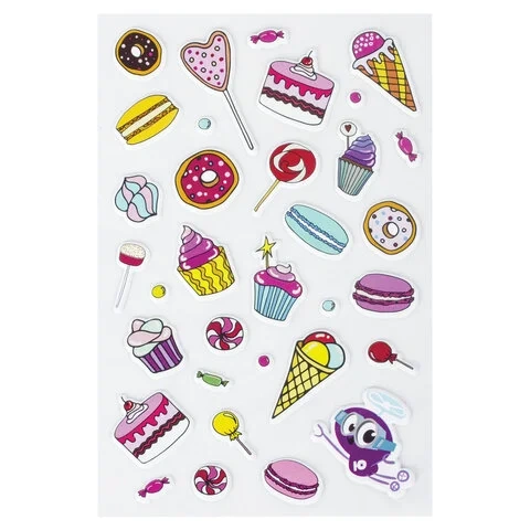 В наборе содержатся мягкие зефирные наклейки с изображением разнообразных сладостей в количестве 33 штук. Наклейки отличаются высочайшим качеством печати и цветопередачи. Яркие торты, кексы, пончики и леденцы будут аппетитно выглядеть на тетрадях, дневниках, гаджетах и оригинально украсят любую поделку.