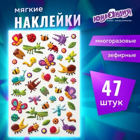 Наклейки зефирные 'Букашки', многоразовые, 10х15 см, ЮНЛАНДИЯ, 661828