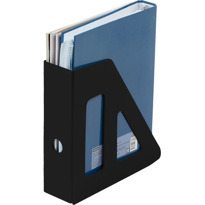 Вертикальный накопитель Attache предназначен для хранения и сортировки документов и печатной продукции формата А4. На торце имеется отверстие для удобного снятия накопителя с полки. Изготовлен из пластика. Цвет: черный. Размеры изделия (ДxШxВ): 25070253 мм.