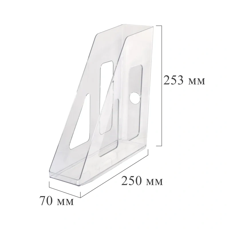 Вертикальный накопитель Attache предназначен для хранения и сортировки документов и печатной продукции формата А4. На торце имеется отверстие для удобного снятия накопителя с полки. Изготовлен из пластика. Цвет: прозрачный. Размеры изделия (ДxШxВ): 25070253 мм.