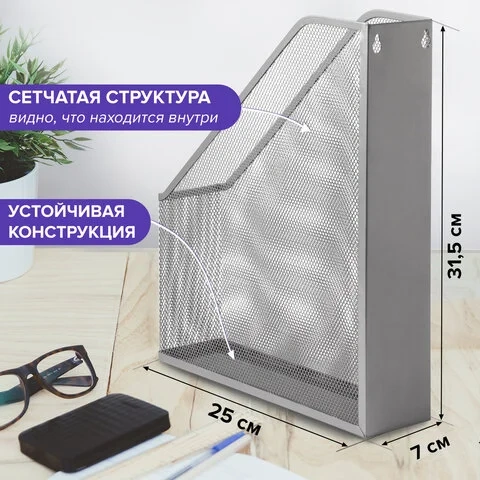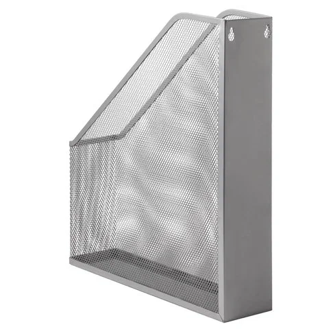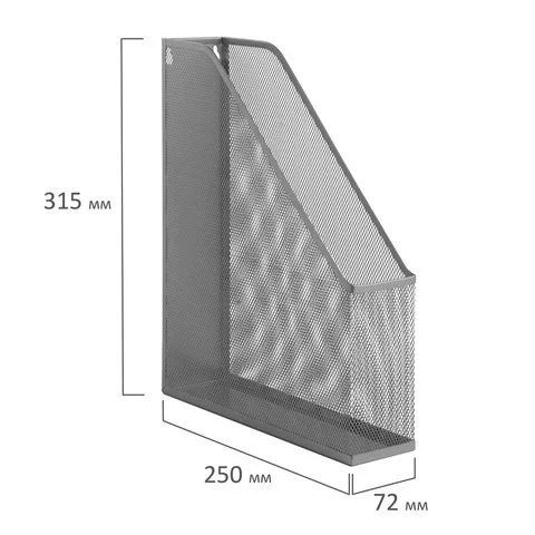 Выполнен из металла серебристого цвета с одним отделением. Предназначен для хранения бумаг формата А4. Представляет собой устойчивую долговечную неразборную конструкцию с сетчатыми боковыми поверхностями. Есть отверстия для настенного размещения. Размеры: высота - 315 мм, ширина - 72 мм, глубина - 250 мм.