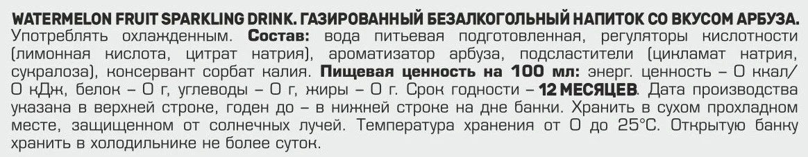 Напиток Aziano Арбуз газированный, 350мл х 12шт - газированный напиток с оригинальным вкусом арбуза, который отлично утоляет жажду и освежает. Он не содержит в своем составе сахара, поэтому подходит даже тем, кто придерживается правильного питания или диеты. Особого внимания заслуживает оригинальная упаковка напитка от 'Азиано' — прозрачная пластиковая банка с ключом.