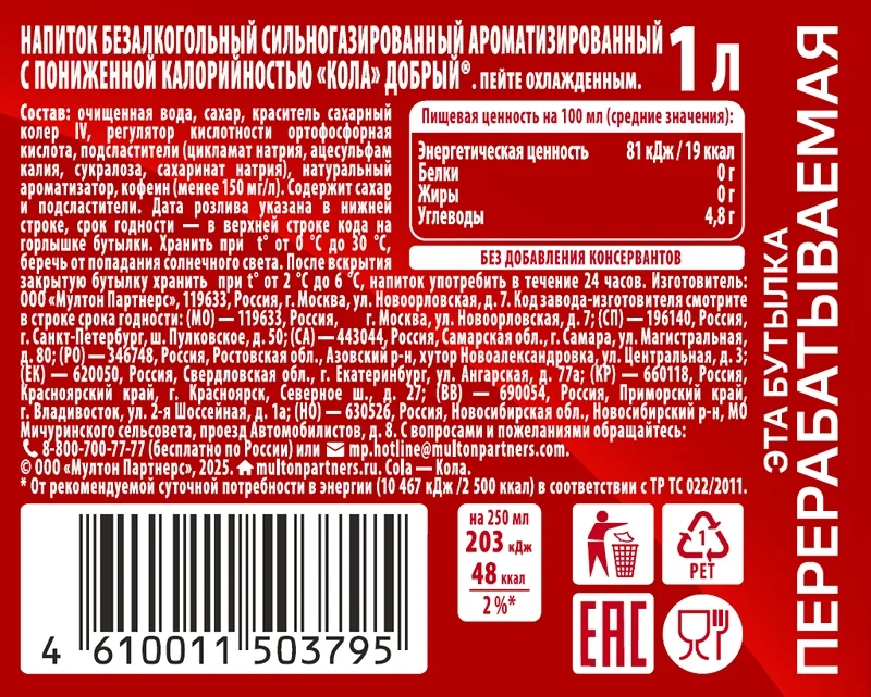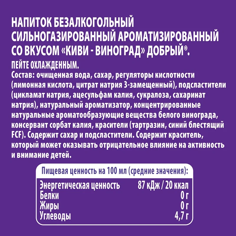 Вода, сахар, регулятор кислотности кислота ортофосфорная, краситель сахарный колер IV, ароматизаторы (содержат кофеин), стабилизатор гуммиарабик, подсластители: цикламовой кислоты натриевая соль, ацесульфам калия, сукралоза, сахарин (натриевая соль); консервант бензоат натрия.