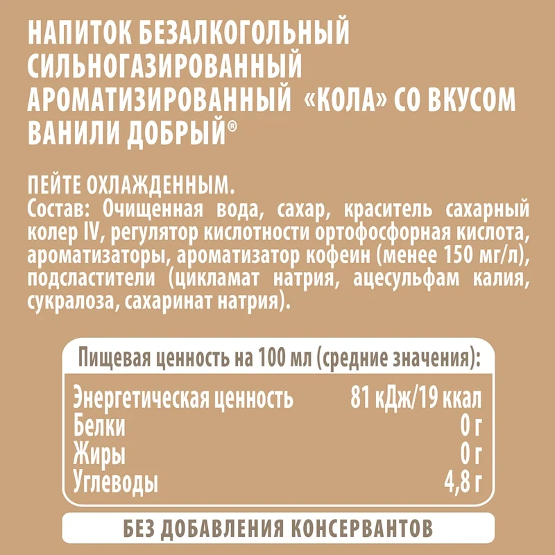 Новый сильногазированный напиток Добрый Кола со вкусом ванили — это баланс аромата ванили и яркого вкуса колы. Освежающий заряд хорошего настроения, которым так хочется делиться с тем, кто рядом! Пейте охлажденным!