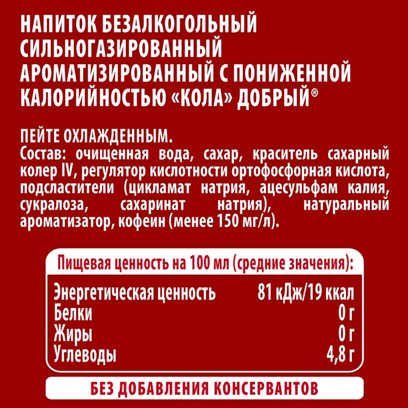 Очищенная вода, сахар, регуляторы кислотности (лимонная кислота, цитрат натрия 3-замещенный), натуральные ароматизаторы, консервант сорбат калия, подсластители (цикламат натрия, ацесульфам калия, сукралоза, сахаринат натрия).