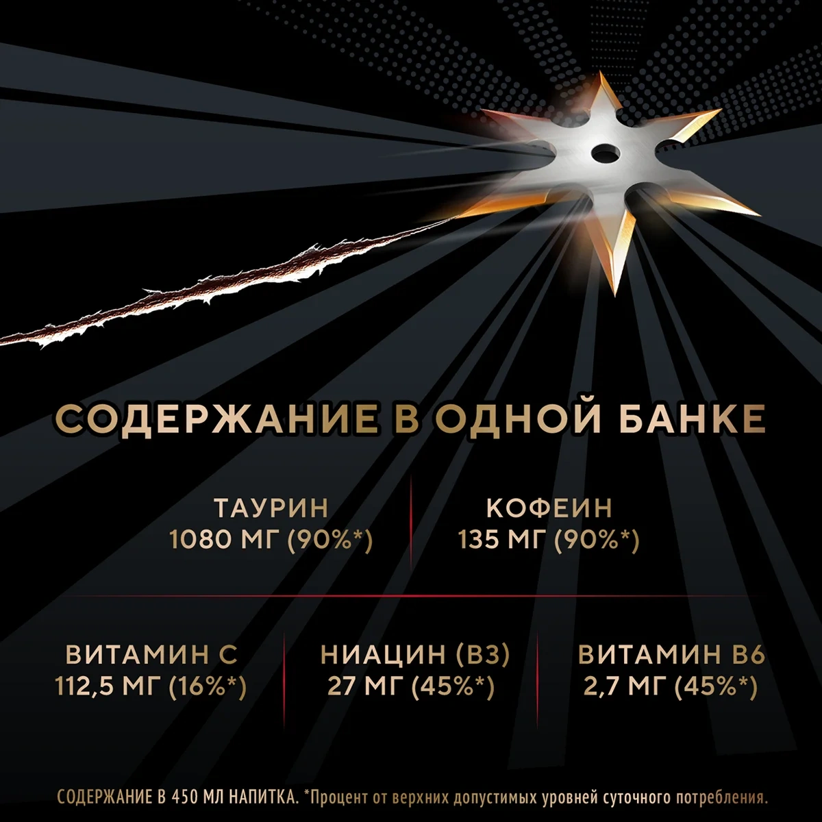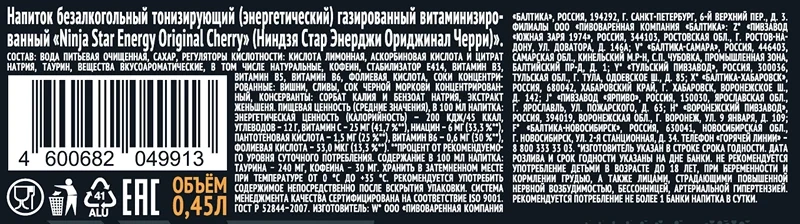 Вода, сахар, концентрированный гранатовый сок, концентрированный яблочный сок, регуляторы кислотности (лимонная кислота, яблочная кислота, цитрат натрия 3-замещенный), стабилизатор пектины, таурин, ароматизаторы, кофеин, подсластители (сукралоза, ацесульфам калия), витамины (ниацин (В3), пантотеновая кислота (В5), В6, В12), красители (синий блестящий FCF, красный очаровательный AC).