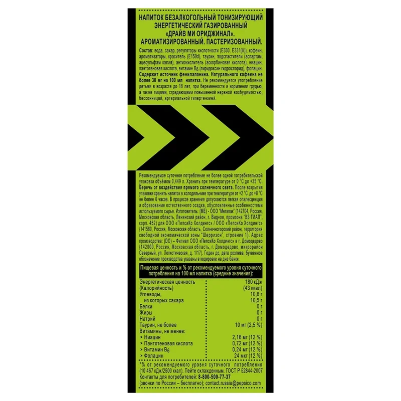 Напиток ДРАЙВ МИ Ориджинал, энергетический, 0,449 л способен наполнить энергией и дать толчок к решению сложных задач. Содержащийся в составе кофеин стимулирует работу нервной системы, заставляя ее выдавать высокие результаты. Напиток поможет сконцентрироваться при решении проблем и собраться с силами в сложной ситуации. Благодаря сладкому ненавязчивому вкусу им легко утолять жажду, в охлажденном виде он еще вкуснее. В формуле присутствуют витамины С и В6, подпитывающие организм энергией, и помогающие восстановить иммунитет. Купить напиток ДРАЙВ МИ Ориджинал, энергетический, 0,449 л можно на нашем сайте.Состав: вода, сахар, регуляторы кислотности (E330, E331(iii)), кофеин, ароматизаторы, краситель (E150d), таурин, подсластители (аспартам, ацесульфам калия), витамин С (аскорбиновая кислота), ниацин, пантотеновая кислота, витамин В6 (пиридоксин гидрохлорид), фолацин.Тип: энергетический напиток.Условия хранения: от 0C до 35C.Бренд: Drive Me.Страна-изготовитель: Россия.Упаковка: банка-туба. Рекомендуемое суточное потребление данного товара - не более одной банки. Не рекомендуется употребление детьми в возрасте до 18 лет, при беременности и кормлении грудью, а также лицами, страдающими повышенной нервной возбудимостью, бессонницей, артериальной гипертензией