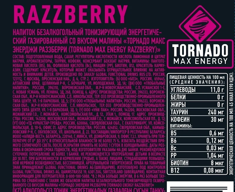 Напиток энергетический Tornado Max Energy Razzberry, 450мл x 12 шт - яркий, узнаваемый, вкус малины заряжает энергией и позитивными вайбами. Повышает скорость реакции и помогает сконцентрироваться. Содержит ингредиенты высокого качества: кофеин, таурин, витамины B, сахар.