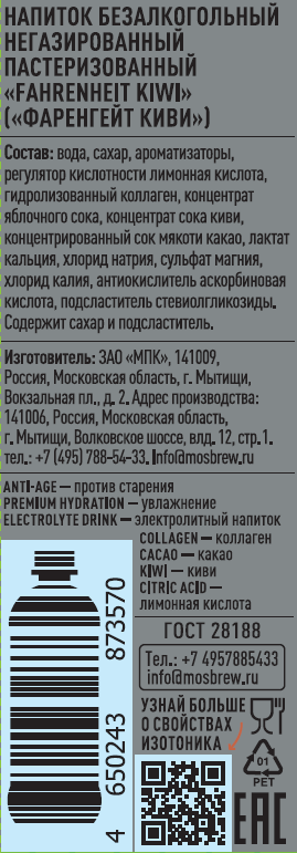 Fahrenheit Isotonic, Kiwi - освежающий изотоник со вкусом киви, который помогает зарядиться и быстро восстановить силы и энергию после интенсивной тренировки или насыщенного дня. Вода не содержит сахара, обогащена магнием, кальцием, натрием, калием и коллагеном. Fahrenheit - только яркий вкус натуральных компонентов и заряд витаминов для быстрой перезарядки в удобном формате. Возьмите его с собой на тренировку, учебу, работу, в поездку или на прогулку.