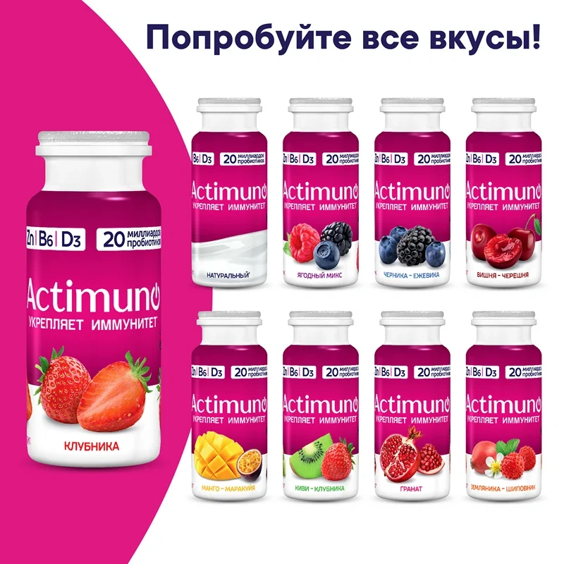 Это один из самых доступных способов ежедневного укрепления иммунитета, ведь в этой маленькой бутылочке так много пользы: 20 миллиардов пробиотиков L.Casei Actimunis, витамины D3 и B6. Всего 2 бутылочки Actimuno в день снижают риск заболеть инфекционным заболеванием на 20% (профилактика общих инфекционных заболеваний). Этот напиток сделан из свежего молока от фермерских коров. После пастеризации в него внесена закваска, а после созревания в тепле — наполнитель на основе пюре манго и сока маракуйи.