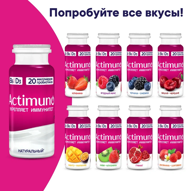Фруктовый напиток Actimuno клубника 1.5%, 95г - это один из самых доступных способов ежедневного укрепления иммунитета, ведь такая маленькая бутылочка представляет собой супермикс: 20 миллиардов пробиотиков L.Casei Imunitass, витамины B6, D3, а теперь еще и цинк! Всего 2 бутылочки Actimuno в день снижают риск заболеть инфекционным заболеванием на 20% (профилактика общих инфекционных заболеваний).