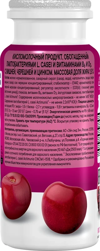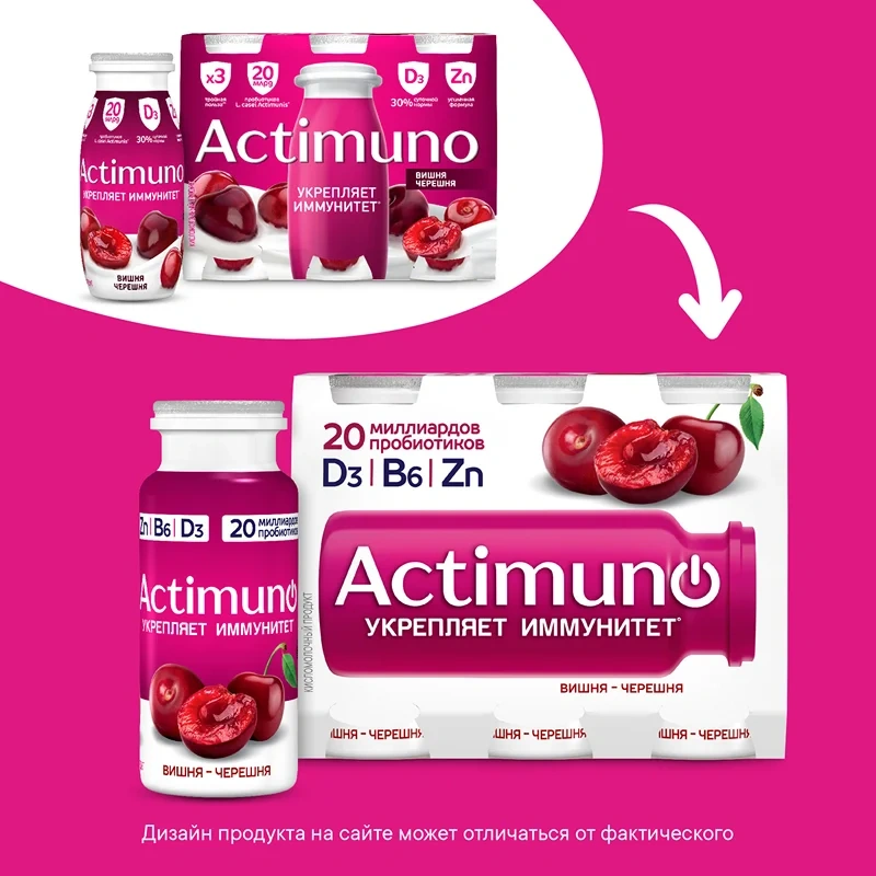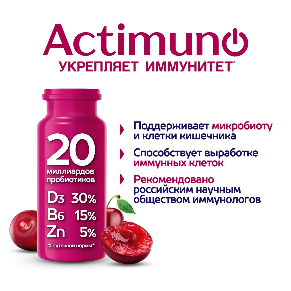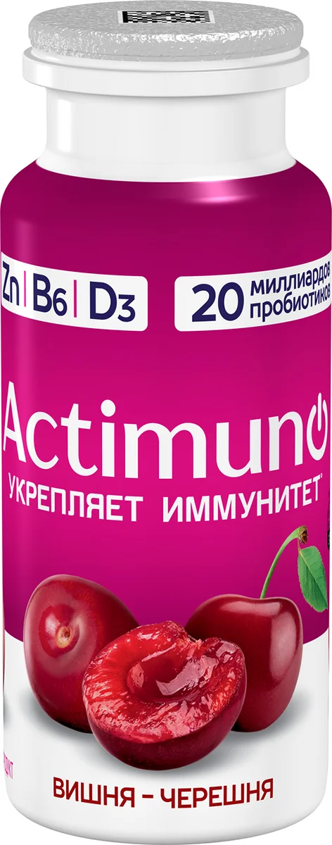 Фруктовый напиток Actimuno вишня-черешня 1.5%, 95г - это один из самых доступных способов ежедневного укрепления иммунитета для детей и взрослых, ведь такая маленькая бутылочка представляет собой супермикс: 20 миллиардов пробиотиков L.Casei Imunitass, витамины B6, D3, а теперь еще и цинк! Всего 2 бутылочки Actimuno в день снижают риск заболеть инфекционным заболеванием на 20% (профилактика общих инфекционных заболеваний).