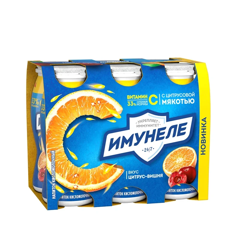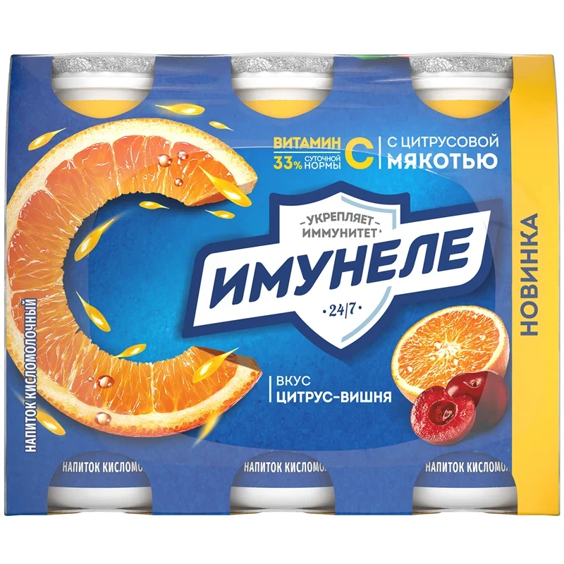 Имунеле со вкусом Цитрус-вишня - вкусный и полезный кисломолочный напиток с цитрусовой мякотью и спелыми ягодами. Напиток содержит 33% суточной нормы витамина С и способствует укреплению иммунитета благодаря комплексу витаминов и лактобактерий. Родители могут позаботиться и об иммунитете своих детей с линейкой кисломолочных продуктов Имунеле for Kids со вкусами, которые понравятся ребенку: Клубничное мороженое, Малиновый пломбир и Тутти-Фрутти. А также новинка: Имунеле for Kids Мангомикс с витамином С и цитрусовой мякотью.
