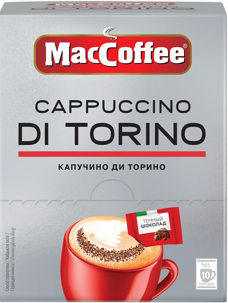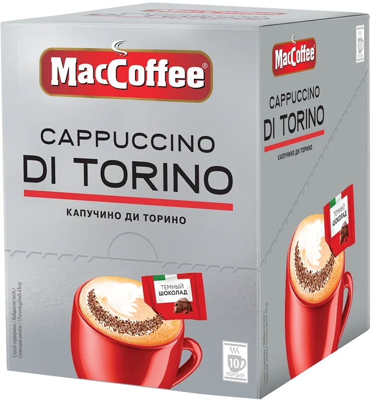 MacCoffee Капучино di Torino - превосходный капучино с высокой пенкой и настоящей шоколадной крошкой из темного бельгийского шоколада. Приготовлен по знаменитой рецептуре из города Турин.